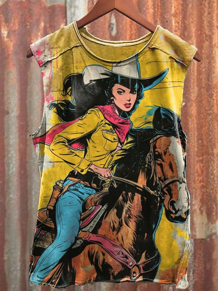 Vintage Horse Riding Cowgirl Art Print Casual Tops