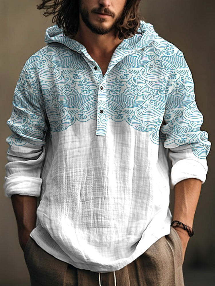 Vintage Japanese Art Sea Wave Linen Hooded Shirt