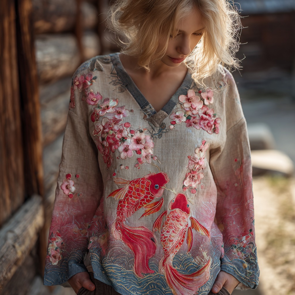 Vintage Pink Koi Floral Embroidery Gradient Linen Blend Shirt