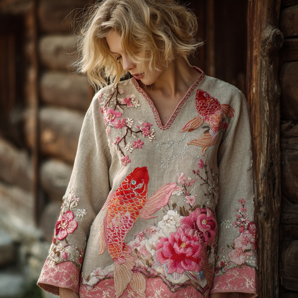 Vintage Pink Koi Floral Embroidery Patchwork Linen Blend Shirt
