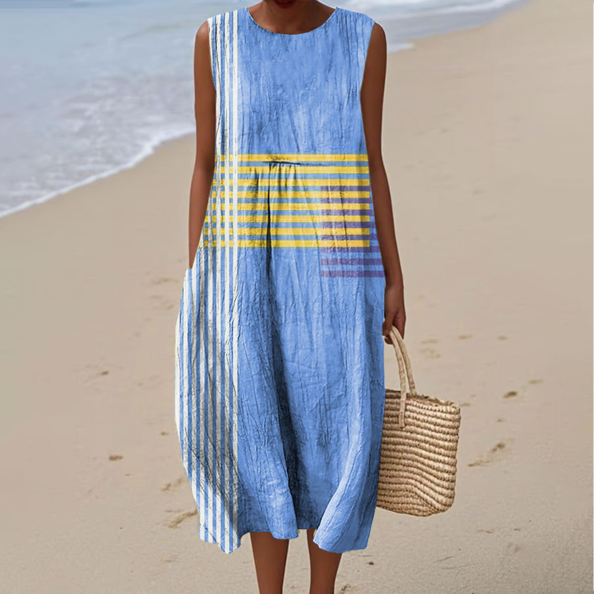 Women's Abstract Geometric Stripes Art Print Sleeveless Cotton Pocket Wrap Dress