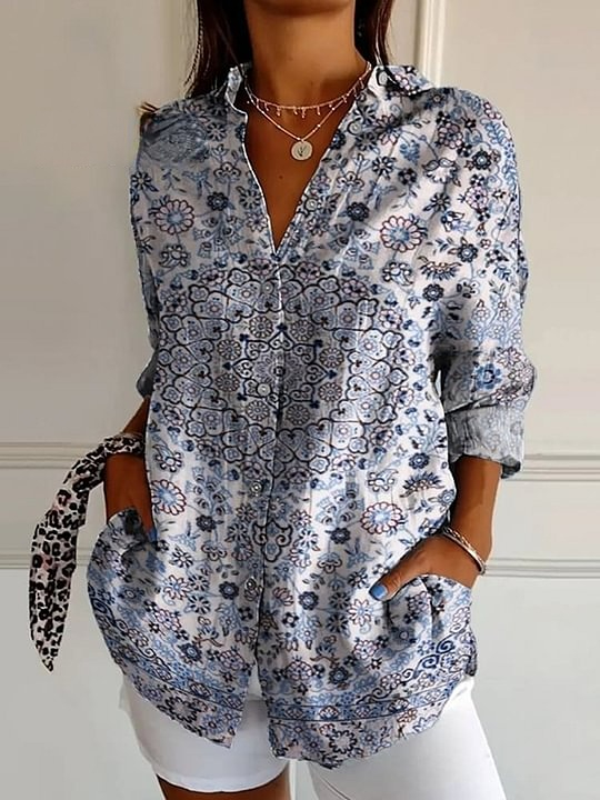 Women's Blue Ethnic Pattern Print Casual Cotton Shirt