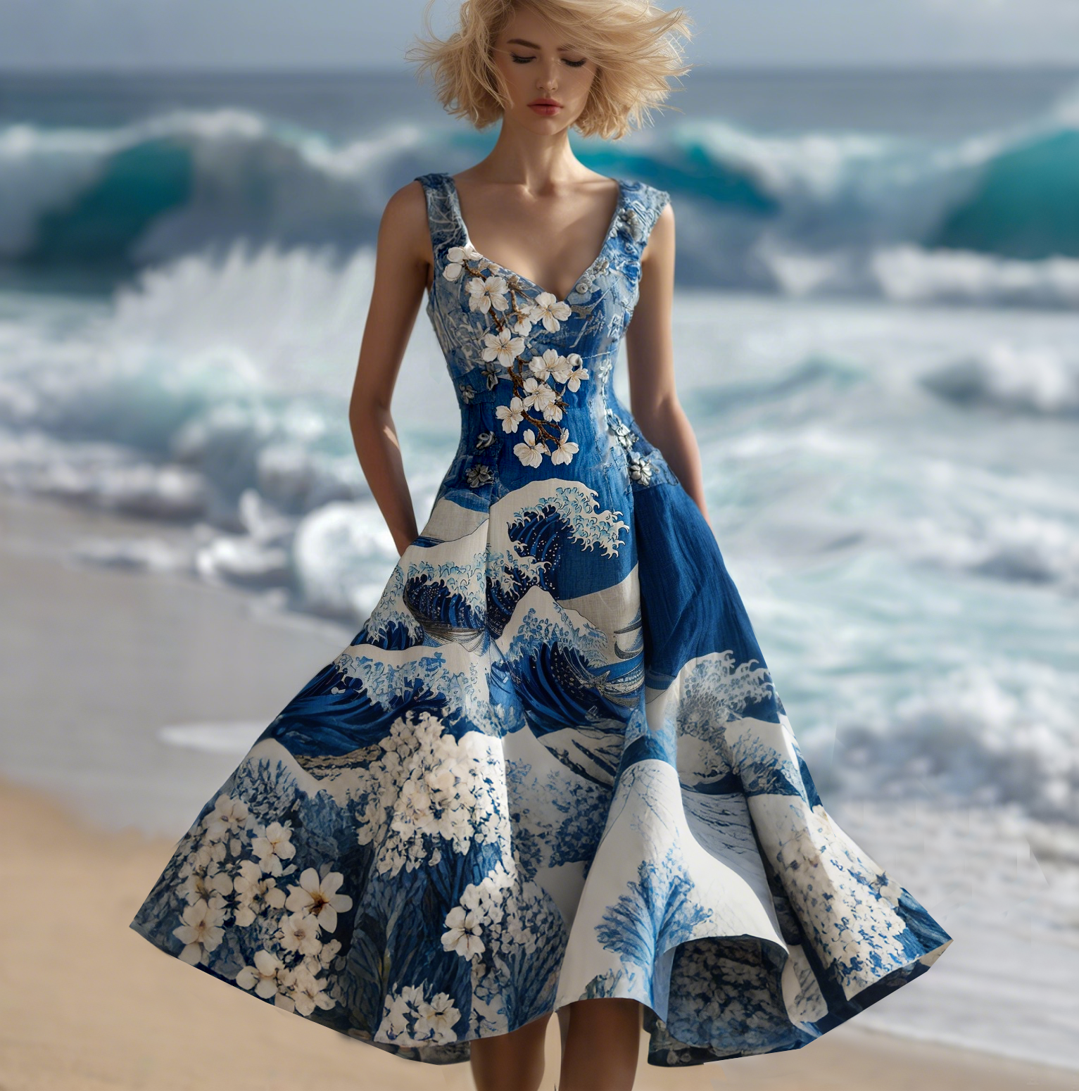 Women's Cherry Blossoms Embroidery And Huge Waves Patchwork Art Linen Dress