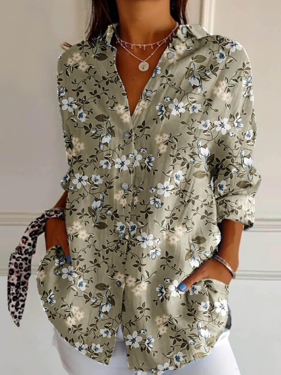 Women'S Elegant Flower Art Print Casual Linen V-Neck Shirt
