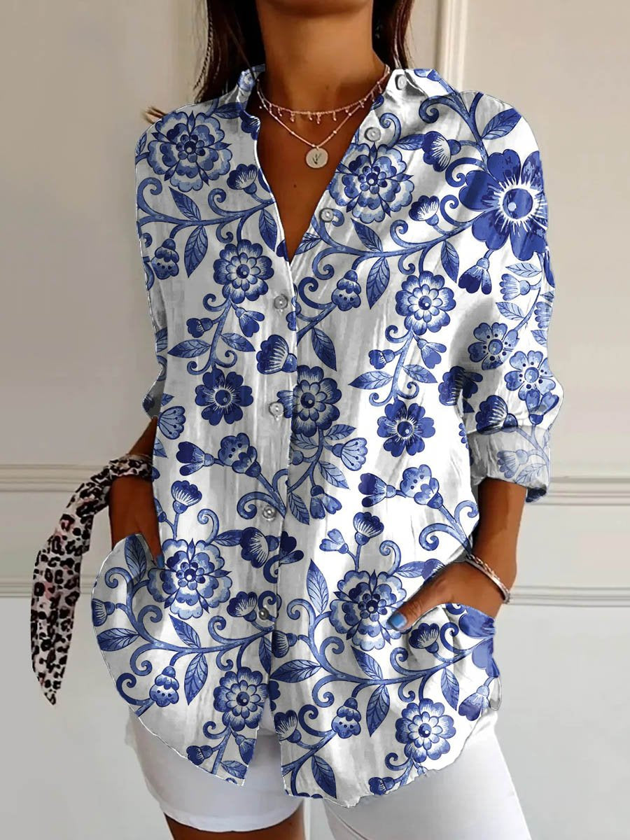 Women's Flower Art Print Casual Cotton Shirt