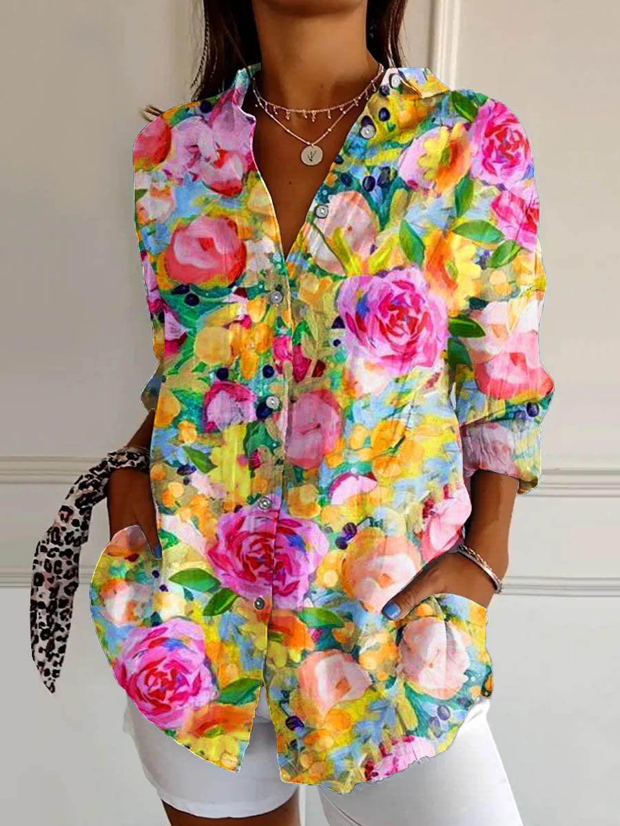 Women's Flower Art Print Casual Cotton Shirt
