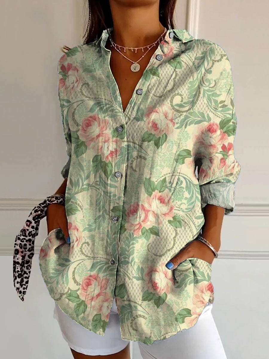 Women's Lovely Floral Art Print Casual Cotton Shirt