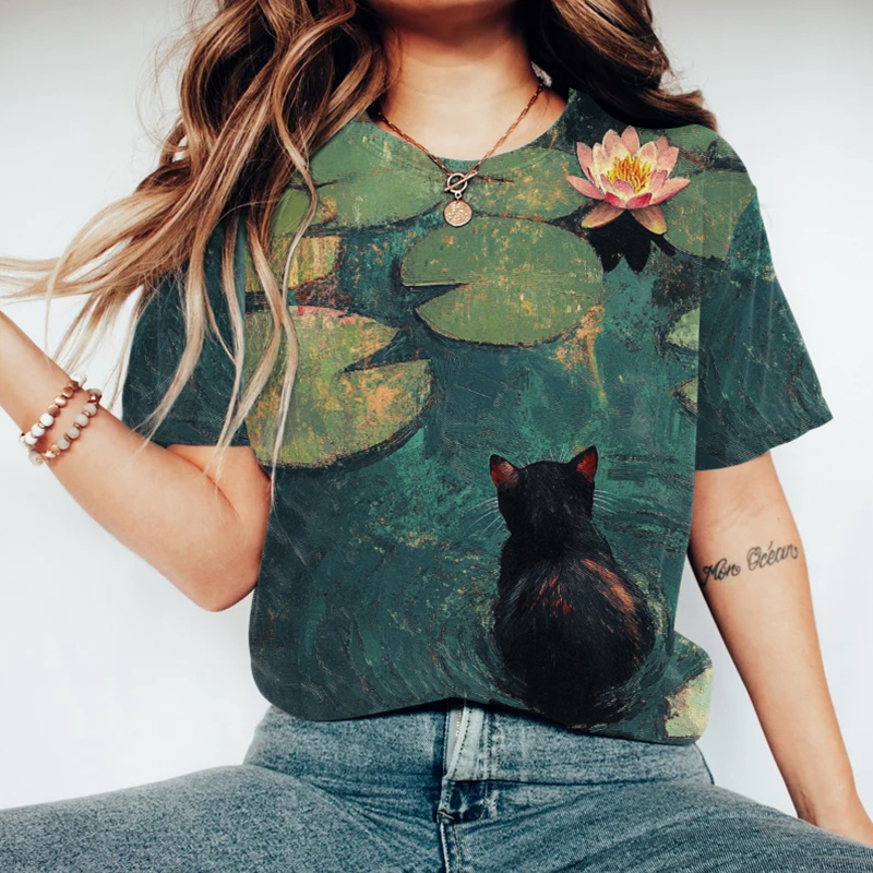 Women's Oil Painting Black Cat And Lotus Print T-shirt