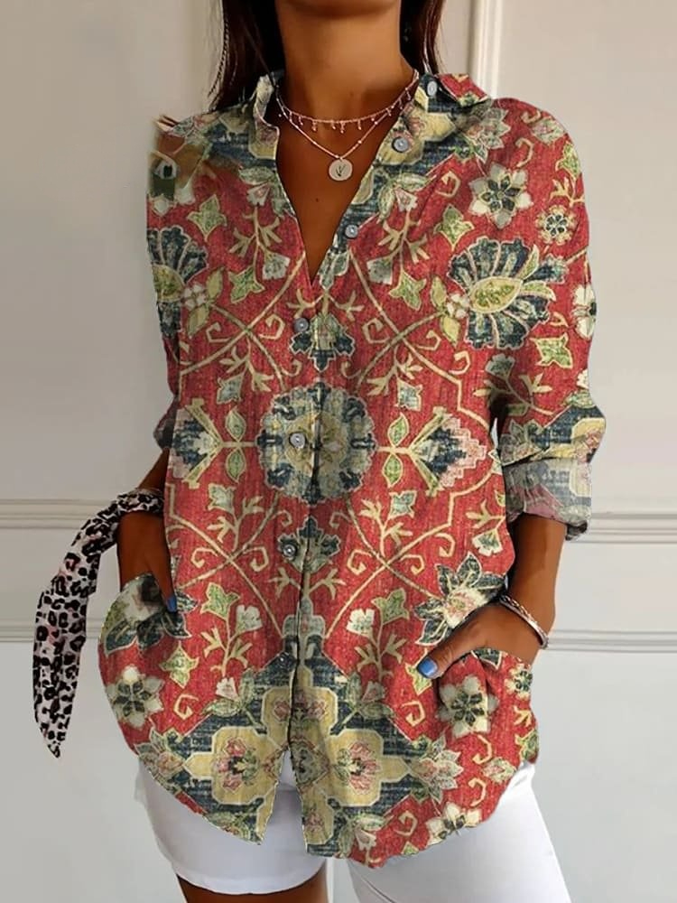 Women's Retro Ethnic Floral Art Print Casual Cotton Shirt