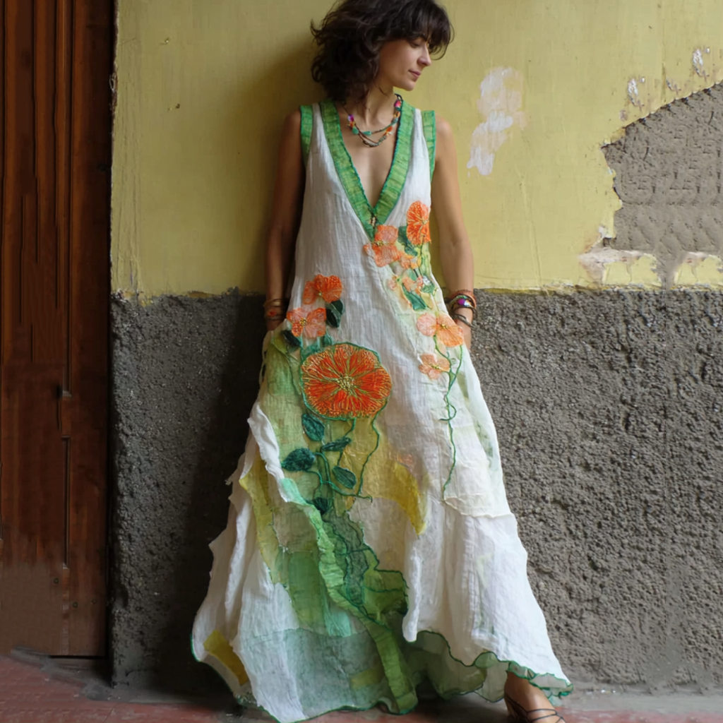 Women's Retro Floral Line Stitching Sleeveless Long Dress