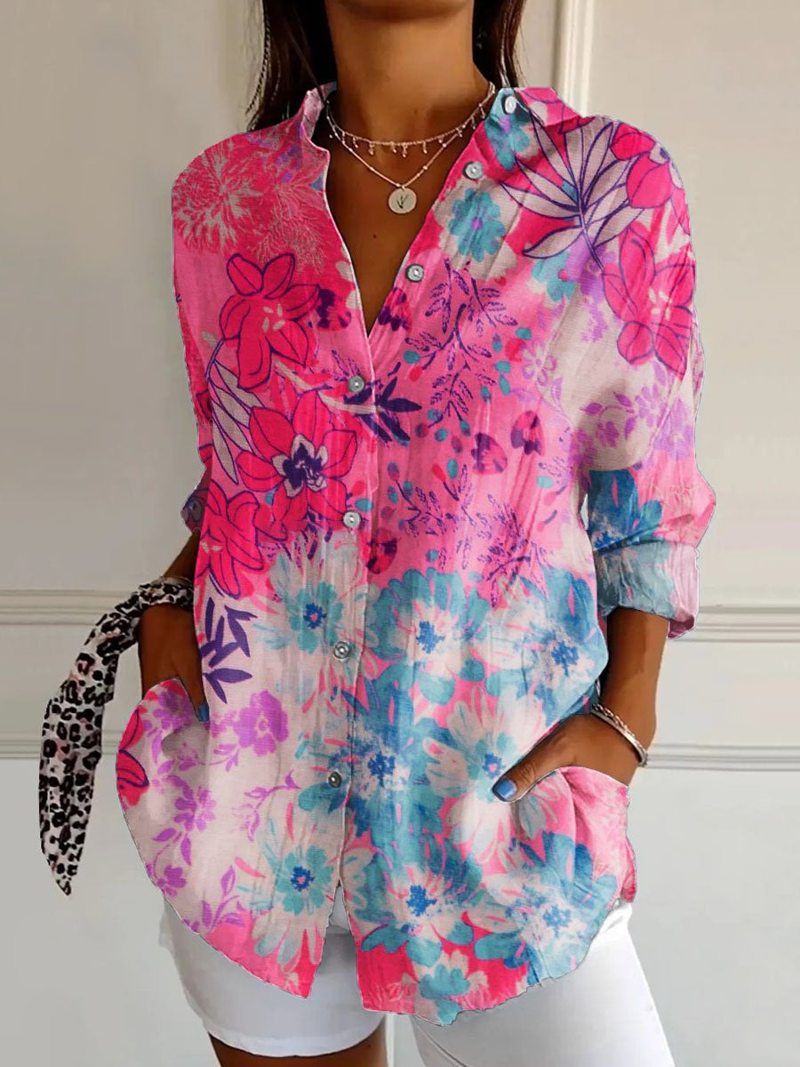 Women's Retro Flower Art Print Casual Cotton Shirt