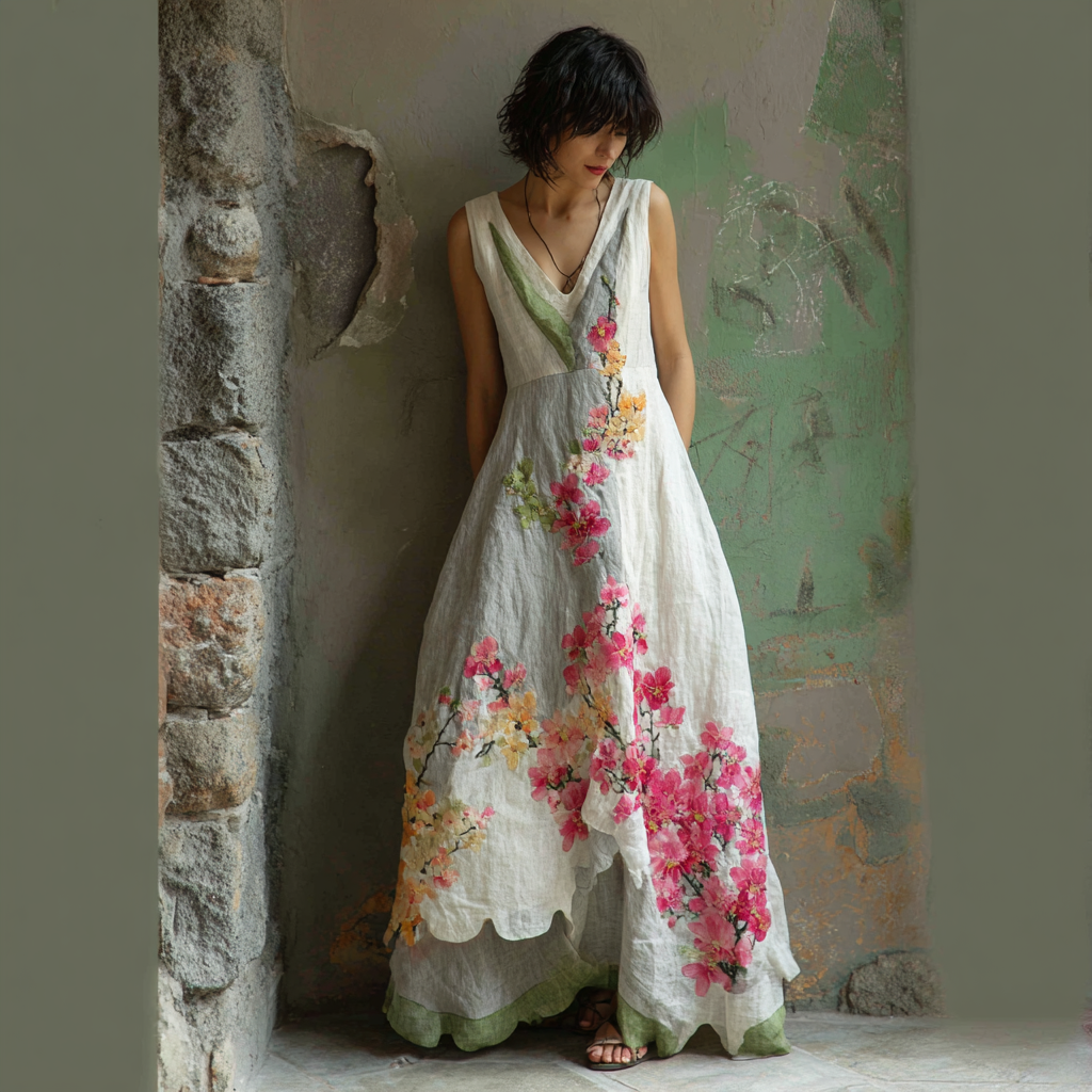 Women's Retro Japanese Sakura Splicing Sleeveless Long Dress