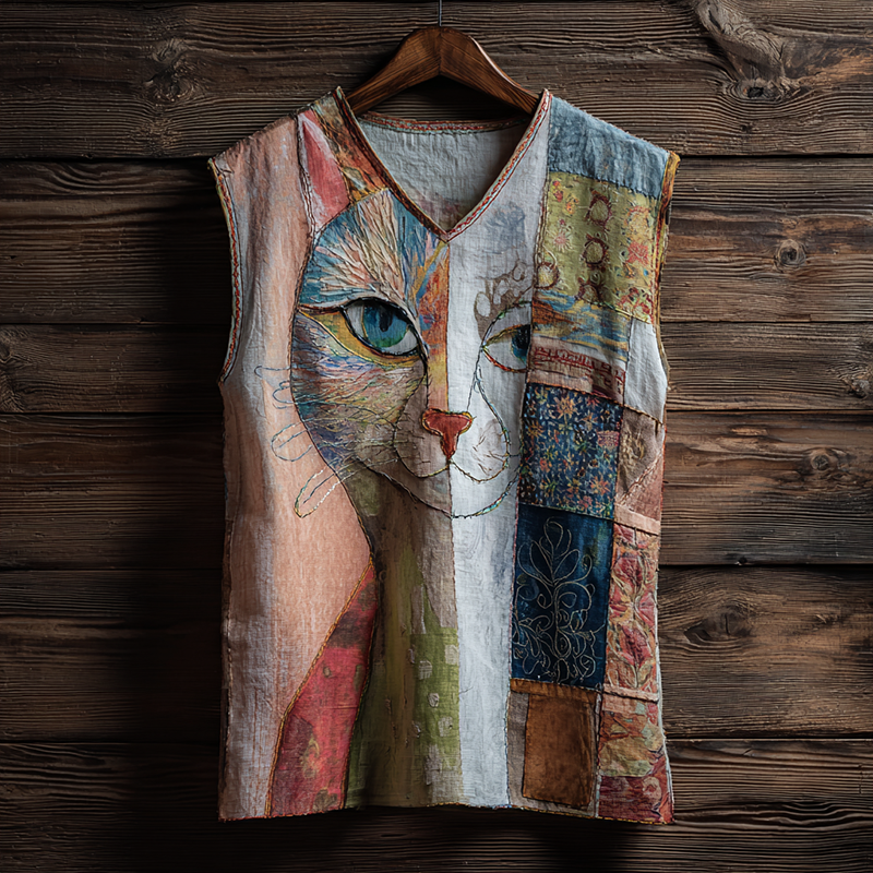 Women's Vintage Abstract Floral Cat Oil Painting Art Patchwork Vest