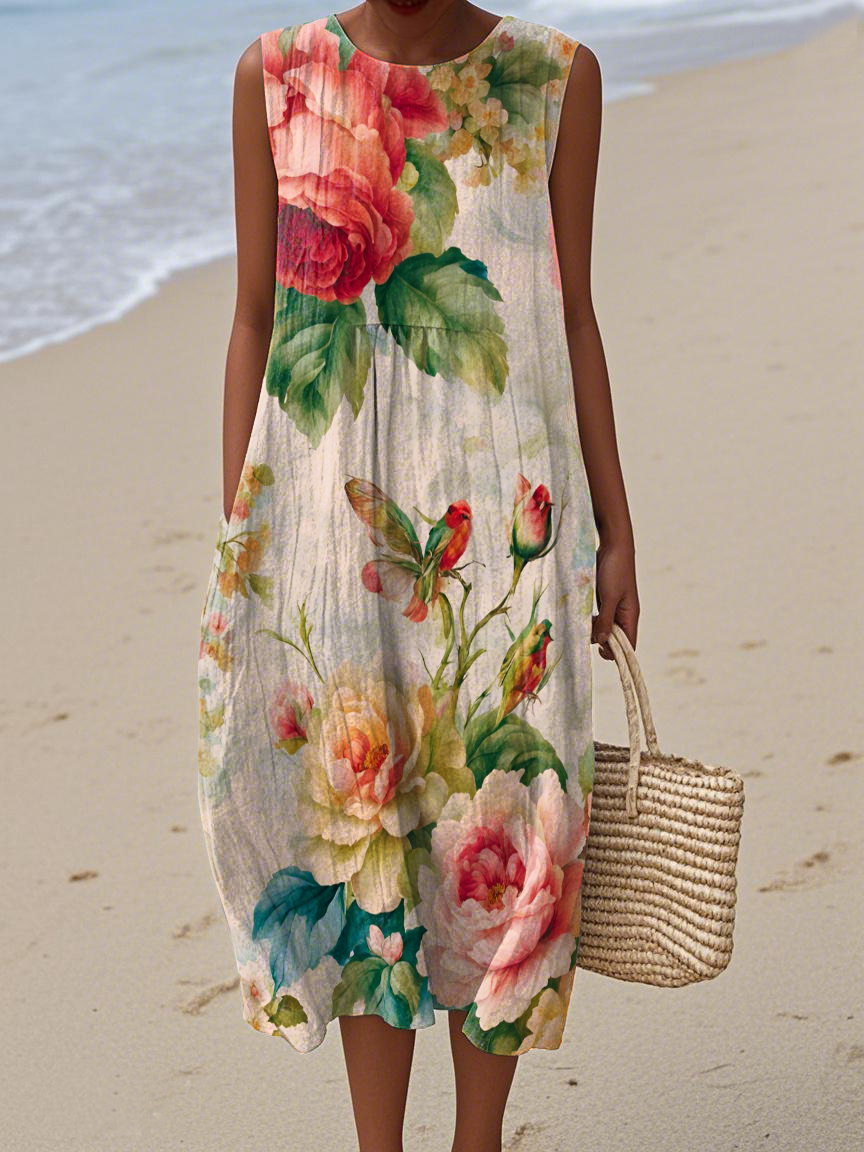 Women's Vintage Elegant Floral Print Cotton and Linen Dress
