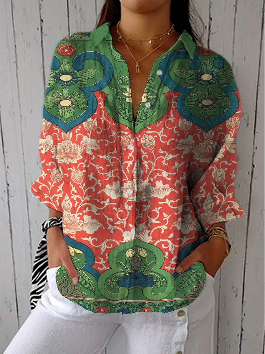 Women's Vintage Floral Art Print Casual Cotton Linen V-neck Shirt