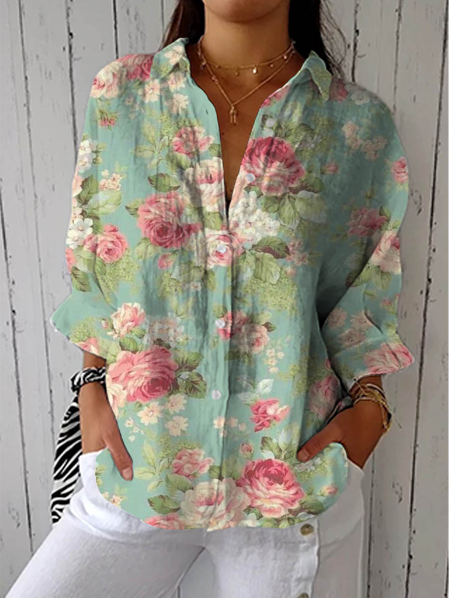 Women's Vintage Floral Art Print Casual Cotton Linen V-neck Shirt