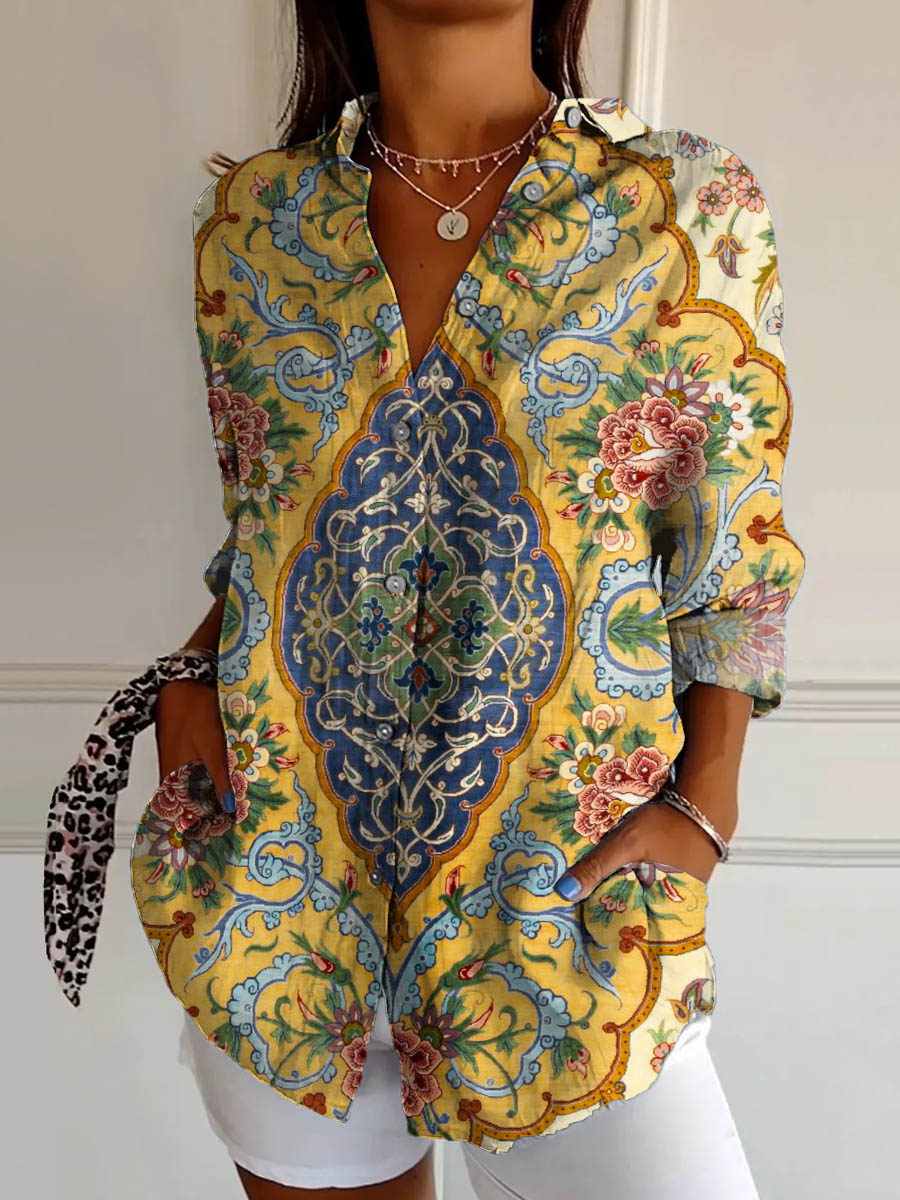 Women's Vintage Floral Pattern Art Print Casual Cotton Shirt