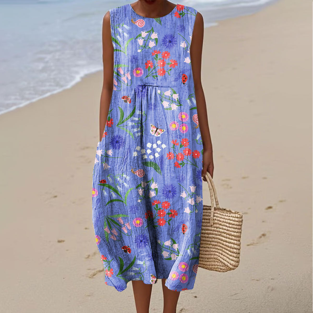 Women's Vintage Flower Art Print Sleeveless Cotton Pocket Wrap Dress