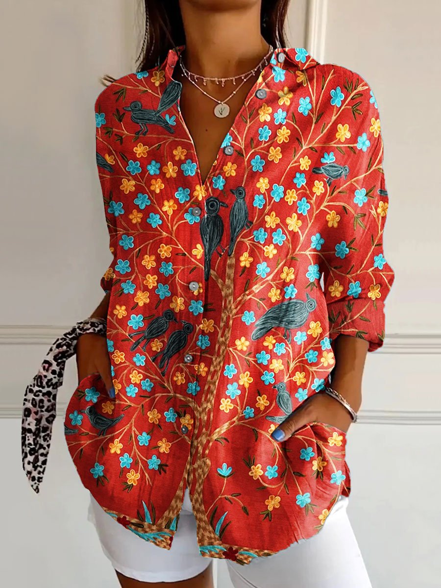 Women's Vintage Flower Bird Tree Art Print Casual Cotton Shirt