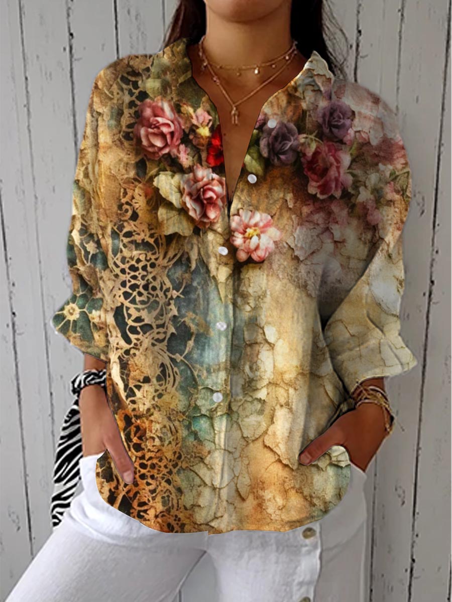 Women's Vintage Lovely Floral Art Print Casual Cotton Linen V-neck Shirt